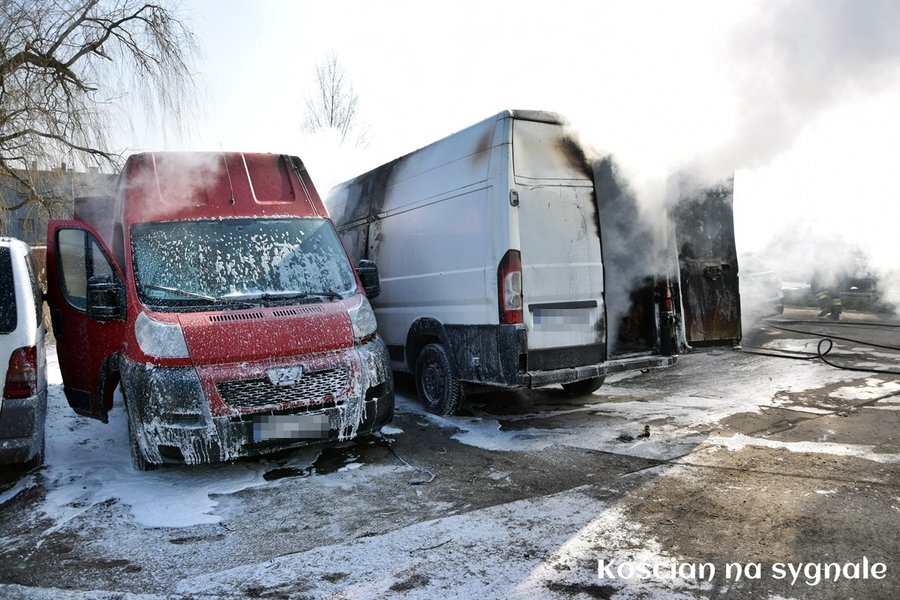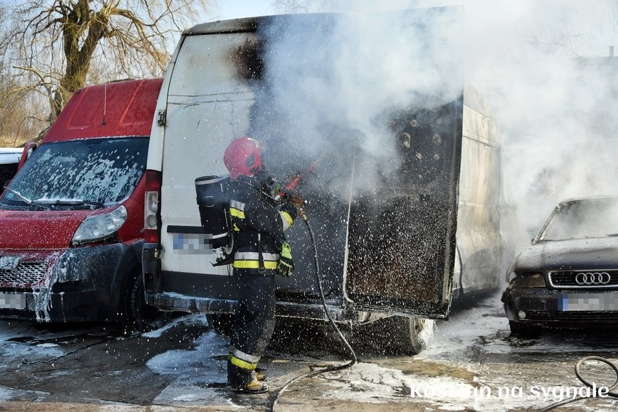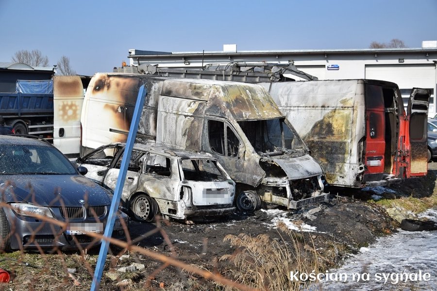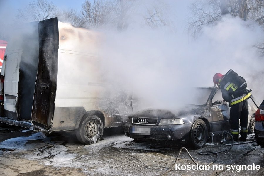 Pożar wybuchł dziś (3.03.2018) około godziny 12.30. Prawdopodobnie od zwarcia instalacji elektrycznej zapalił się dostawczy fiat ducato. Po chwili ogień rozprzestrzenił się na zaparkowane obok auta. Z pożarem przez dwie godziny wałczyło 14 strażaków z JRG Kościan i OSP Kościan. Ogień doszczętnie strawił fiata i osobowe audi oraz uszkodził peugeota oraz bmw. Straty oszacowano wstępnie na 50 tysięcy złotych. Okoliczności zdarzenia wyjaśnia kościańska policja.