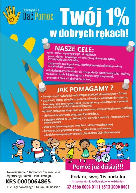 Działania te można wesprzeć przekazując jeden procent podatku dochodowego. Ta pomoc nic nie kosztuje, a może wiele zmienić. Stowarzyszenie "Dać Pomoc" jest organizacją pożytku publicznego i zarejestrowane jest w Krajowym Rejestrze Sądowym pod numerem 0000064865. Wystarczy ten numer wpisać do rocznego zaznania podatkowego.