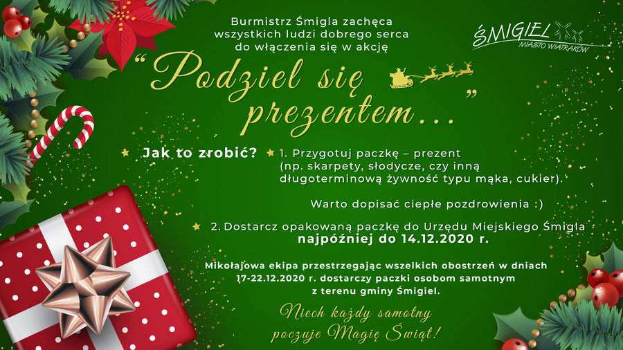 Każdy, kto chce sprawić wyjątkowe święta samotnym mieszkańcom gminy Śmigiel może przygotować paczkę-prezent i do 14 grudnia dostarczyć do Urzędu Miejskiego Śmigla. Zapakowana paczka zostanie przekazana przez ekipę mikołajową samotnym mieszkańcom gminy.