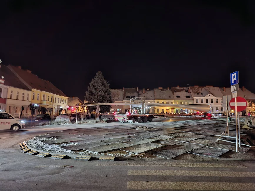 Drugą noc z rzędu mieszkańcy Śmigla mogli obserwować jak transportuje się potężne elementy turbin wiatrowych. Przejazd przez miasto wymagał precyzyjnego planowania i realizacji transportu.