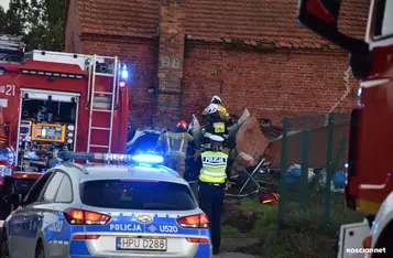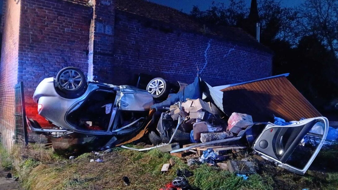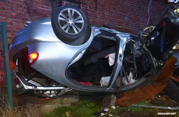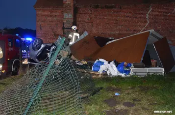 W Wonieściu doszło do poważnego wypadku drogowego. Samochód osobowy wypadł z drogi, staranował ogrodzenie oraz blaszany garaż, po czym zatrzymał się na ścianie budynku gospodarczego.
