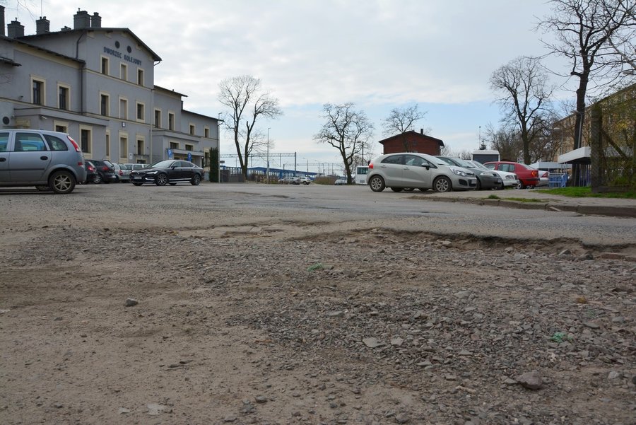 Przed budynkiem dworca PKP w Kościanie kierowcy parkują jak chcą. Żeby dostać się tam samochodem trzeba przejechać fragment drogi dziurawej niczym szwajcarski ser. Czy coś w najbliższym czasie się zmieni?