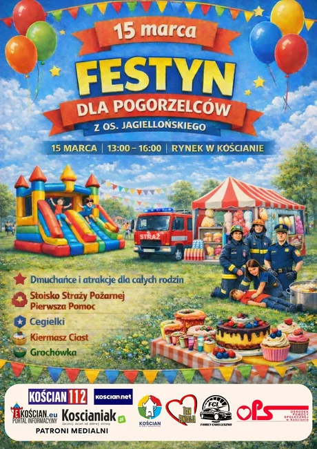 15 marca na rynku w Kościanie odbędzie się festyn charytatywny na rzecz rodzin poszkodowanych w pożarze na osiedlu Jagiellońskim. Wydarzenie ma na celu wsparcie osób, które w wyniku tragicznego zdarzenia straciły dobytek.