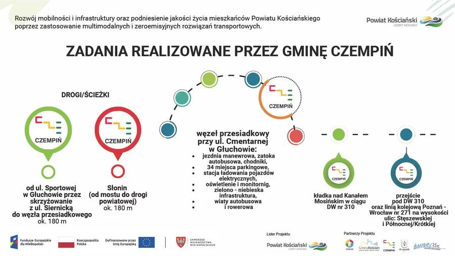 - w gminie Czempiń: na odcinku Gorzyce-Stary Gołębin, Zadory-Piotrowo Pierwsze, na ul. Sportowej wraz z budową węzła przesiadkowego w Głuchowie,