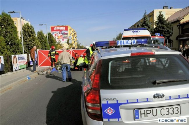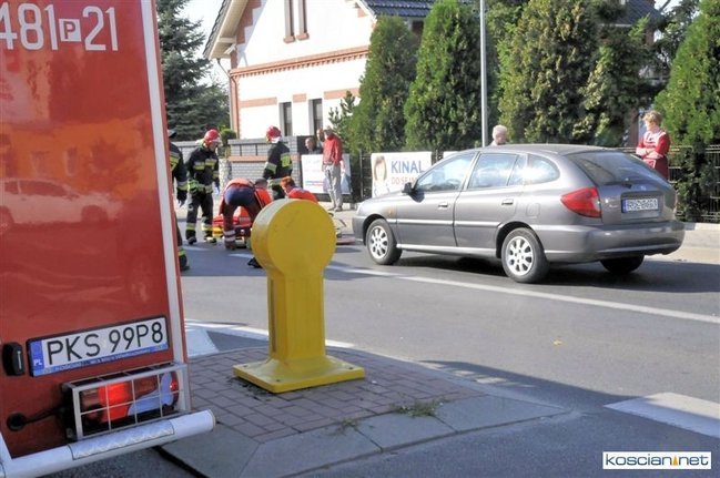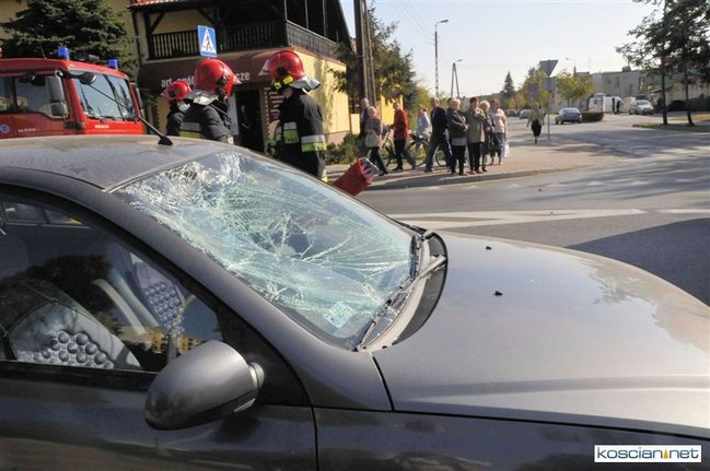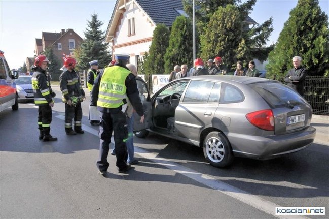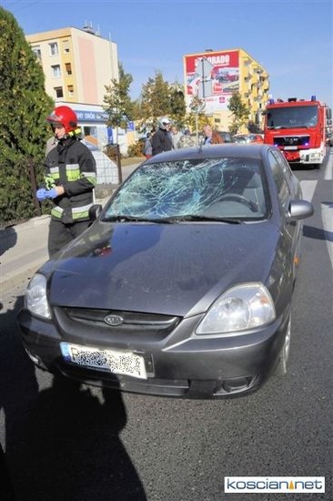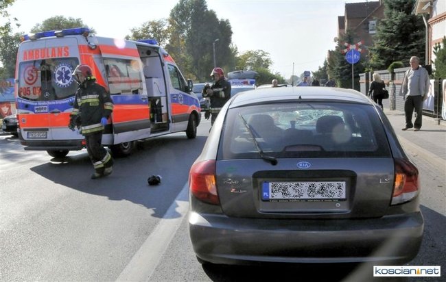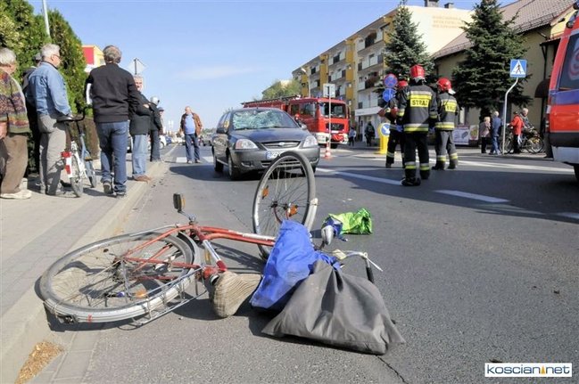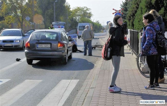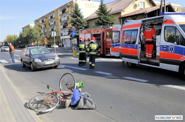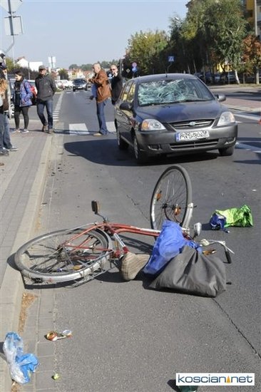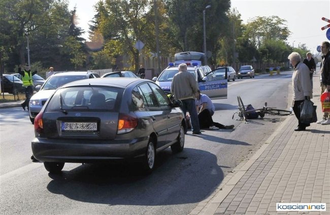 Do zdarzenia doszło o godzinie 13.05. Jadąca rowerem po chodniku 71-letnia mieszkanka Kościana chcąc przejechać na drugą stronę ulicy Śmigielskiej wjechała wprost pod koła prawidłowo jadącego samochodu kia rio prowadzonego przez 67-letniego kościaniaka. Rowerzystkę ze złamanym biodrem i obojczykiem przewieziono do szpitala. Uczestnicy zdarzenia byli trzeźwi.