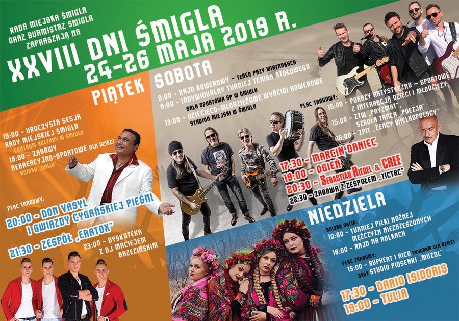 W sobotę o godz. 9 przy wiatrakach rozpocznie się rajd rowerowy. Natomiast w sali sportowej przy śmigielskiej Szkole Podstawowej ruszą rozgrywki w ramach indywidualnego turnieju tenisa stołowego. Na godz. 13 zaplanowano wyścigi rowerowe na stadionie miejskim. O godz. 15 ruszy zabawa na placu targowym. Dla dzieci i młodzieży będą pokazy artystyczne i sportowe. Zaprezentują się Zespół Tańca Współczesnego Pryzmat i tancerze ze Szkoły Tańca „Poezja”. O godz. 16 wystąpi Zespół Pieśni i Tańca „Żeńcy Wielkopolscy”. Od godz. 17.30 publiczność bawić będzie Marcin Daniec. Na godz. 19 zaplanowano koncert kościańskiej grupy Ogień. Po niej na scenie pojawi się gwiazda wieczoru Sebastian Riedel i zespół Cree (godz. 20.30). Od godz. 22.30 do tańca zagra zespól Tictac.
