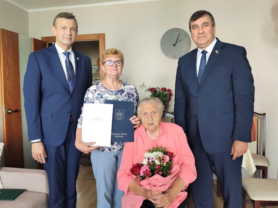 Burmistrz Piotr Ruszkiewicz wraz z Przewodniczącym Rady Miejskiej Kościana Dawidem Olejniczakiem odwiedzili w poniedziałek, 31 lipca, stuletnią mieszkankę Kościana, panią Stefanię Roszak. Samorządowcy złożyli jubilatce życzenia urodzinowe i przekazali okolicznościowe adresy od burmistrza miasta i Prezesa Rady Ministrów.