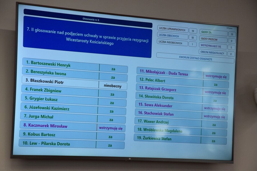 Za przyjęciem rezygnacji było 13 radnych, a 5 wstrzymało się od głosu.