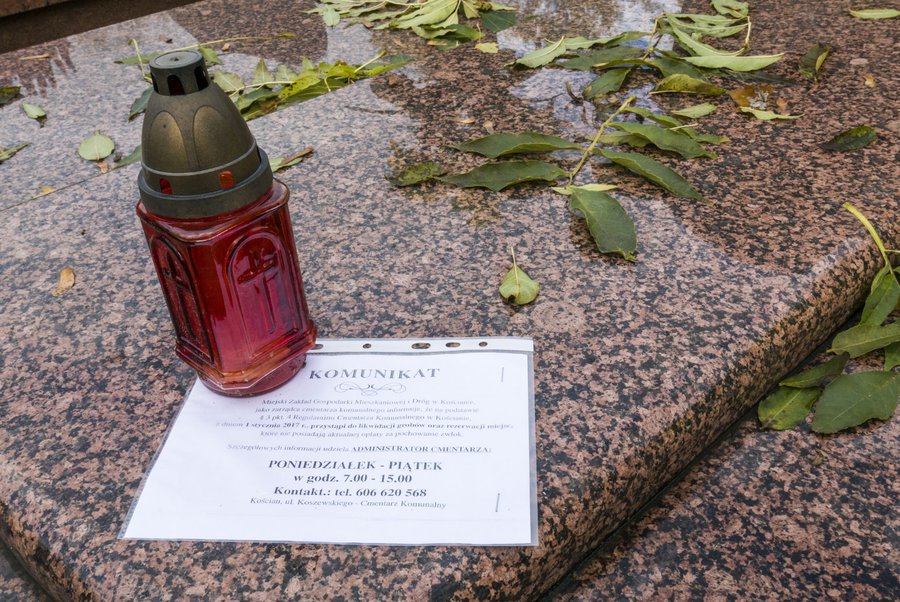Na setkach grobów na cmentarzu komunalnym w Kościanie pojawiły się zafoliowane kartki, na których zarządca cmentarza informuje, że „z dniem 1 stycznia 2017 roku przystąpi do likwidacji grobów oraz rezerwacji miejsc, które nie posiadają aktualnej opłaty za pochowanie zwłok. Szczegółowych informacji udziela administrator cmentarza”. Jak ustaliliśmy o szczegóły poprosiło już kilkudziesięciu krewnych osób pochowanych na cmentarzu komunalnym.
