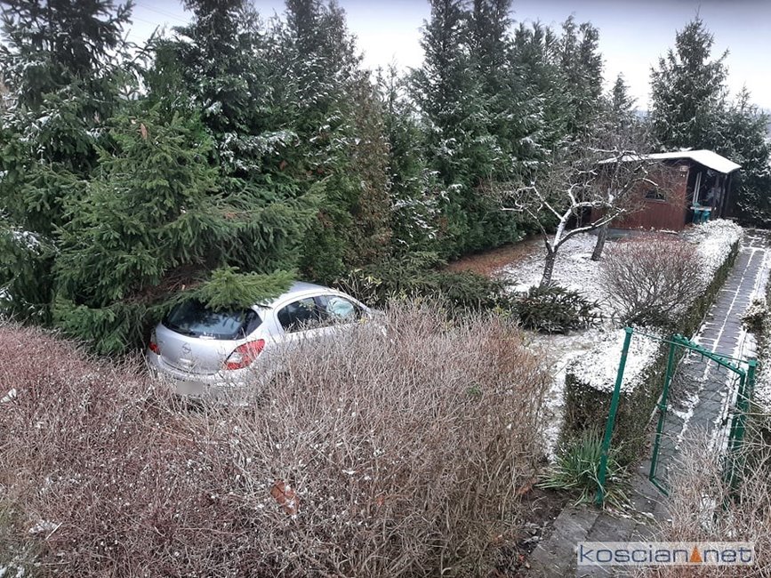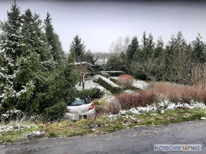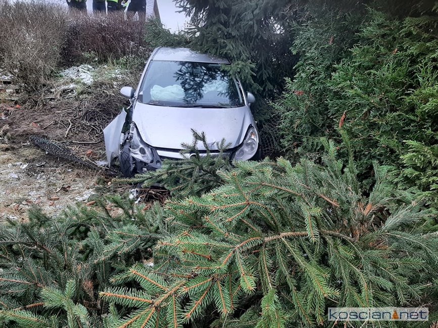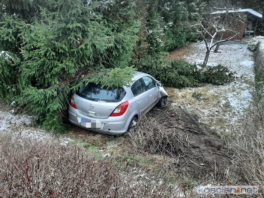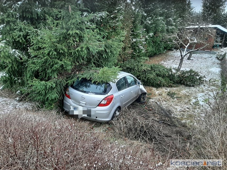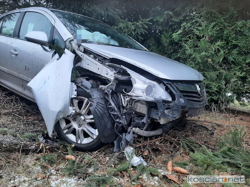 Jadąca w kierunku Szczodrowa, 27-letnia mieszkanka gminy Kościan, straciła panowanie nad oplem corsą. Samochód zjechał do rowu ścinając trzymetrowe drzewo i uszkadzając płot posesji. Kierująca samodzielnie opuściła pojazd. Na badania do kościańskiego szpitala przewieźli ją własnym samochodem krewni.