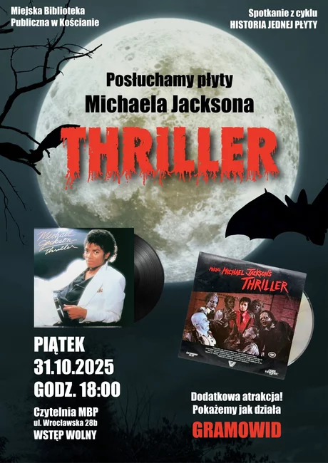 Na wspólne słuchanie płyty i opowieść o tym ponadczasowym wydawnictwie zaprasza Miejska Biblioteka Publiczna. Początek o godzinie 18:00. Dodatkową atrakcją będzie pokaz gramowidu – urządzenia odtwarzającego obraz z płyt winylowych. Wiemy, że wśród posiadanych płyt jest także płyta z teledyskiem Thriller…