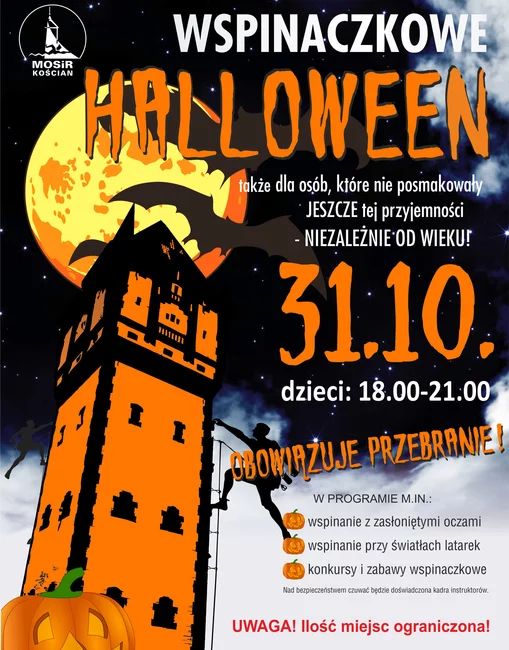 Z kolei od 18:00 do 21:00 trwać będzie wspinaczkowe Halloween dla dzieci w Wieży Ciśnień. W programie między innymi: wspinanie z zasłoniętymi oczami, wspinanie przy światłach latarek, konkursy i zabawy wspinaczkowe. Uwaga: obowiązują przebrania i telefoniczne zapisy pod numerem 609 690 170. Zaprasza Miejski Ośrodek Sportu i Rekreacji.