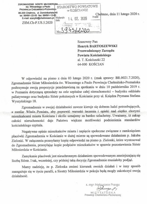 Starosta Kościański wydał dziś oświadczenie, w którym wyjaśnia, że propozycja sprzedaży nieruchomości z przeznaczeniem ich na rozbudowę oddziałów szpitalnych wyszła od Zgromadzenia Sióstr Miłosierdzia Św. Wincentego a Paulo. Z powodu malejących powołań zakon zdecydował się opuścić Kościan.