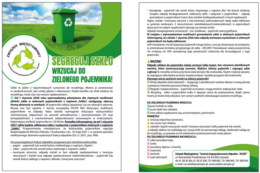Od stycznia 2026 roku mieszkańcy obsługiwani przez SELEKT będą mogli zamienić zielone worki na zielone pojemniki, do których będą wrzucać szkło. Rok później pojemniki staną się obowiązkowe. Mieszkańcy muszą je zakupić na własny koszt.