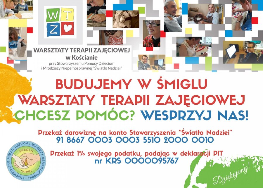 Warsztaty Terapii Zajęciowej działają w Kościanie od 27 lat. Siedziba WTZ to "miejsce na ziemi" 35 fantastycznych ludzi, którzy właśnie tam czują się akceptowani i wyjątkowi. Niestety warunki lokalowe WTZ są niewystarczające. Siedziba znajduje się w bloku i ma powierzchnię około 208 m2. Prowadzące WTZ Stowarzyszenie Światło Nadziei otrzymało od samorządu gminy Śmigiel teren pod budowę nowej siedziby. Teraz prowadzi zbiórkę pieniędzy na rozpoczęcie budowy.