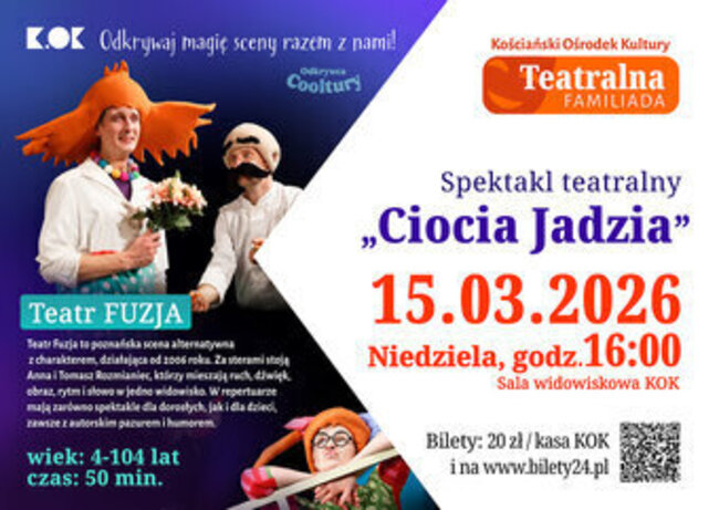 15 marca 2026 r. o godz. 16:00 zapraszamy dzieci i dorosłych na spektakl „Ciocia Jadzia” – ciepłą i pełną humoru opowieść inspirowaną książkami Eliza Piotrowska.