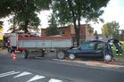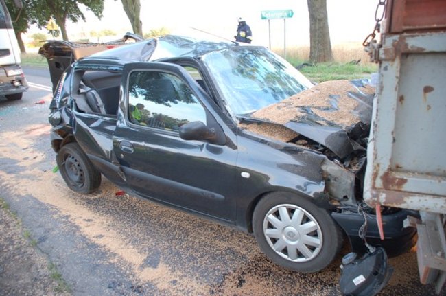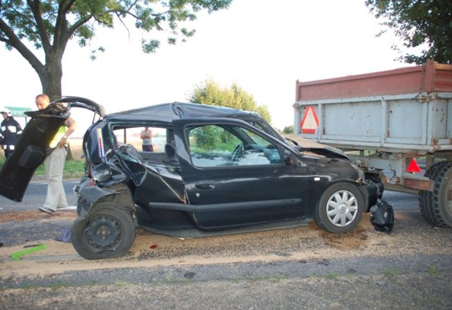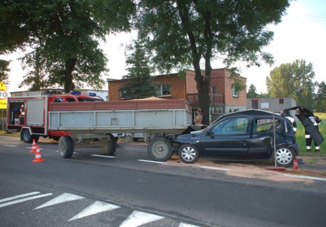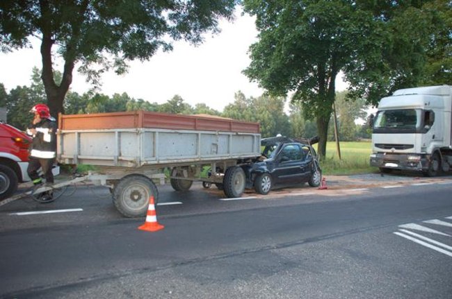 Siła uderzenia spowodowała, że renault został wepchnięty pod stojącą przed nim przyczepę załączoną do ciągnika rolniczego.