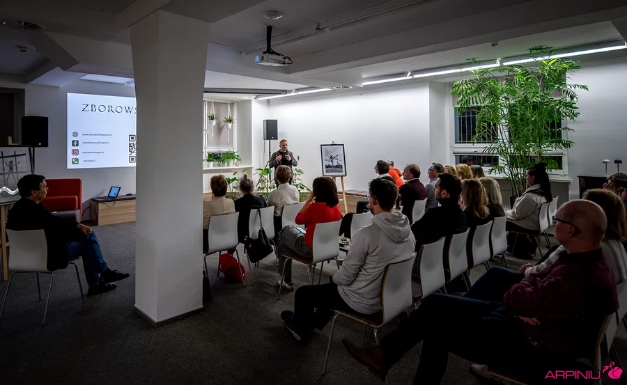Podczas spotkania Piotr Zborowski przedstawił prezentację zdjęć, omawiając swoje projekty autorskie, fotografię portretową oraz akt. Nie zabrakło wątków związanych z udziałem w międzynarodowych konkursach fotograficznych, w których Zborowski odnosi znaczące sukcesy.