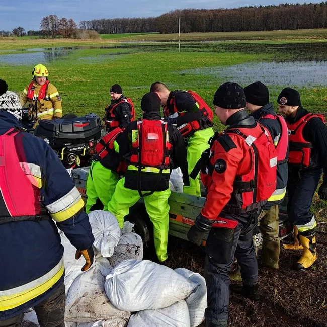 Strażacy z państwowej i ochotniczych straży pożarnych uzupełnili workami z piaskiem wyrwy w wałach Kościańskiego Kanału Obry w okolicy Gryżyny.