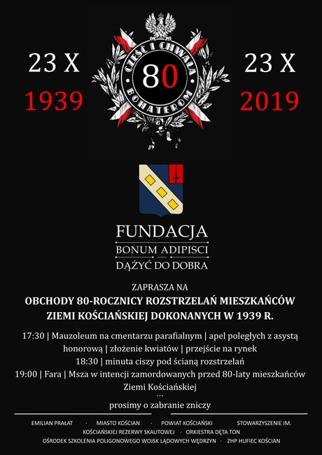 23 października roku mija 80. rocznica rozstrzelań mieszkańców Ziemi Kościańskiej, jakich dokonano na kościańskim Rynku. Właśnie tego dnia Fundacja Bonum Adipisci – Dążyć do Dobra, zaprasza na uroczystości rocznicowe.