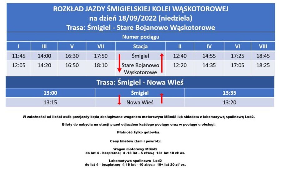 W zależności od liczby osób przejazdy będą obsługiwane wagonem motorowym MBxd2 lub składem z lokomotywą spalinowa Lxd2. Bilety do nabycia na stacji przed odjazdem każdego pociągu oraz w pociągu u obsługi. Płatność tylko gotówką.