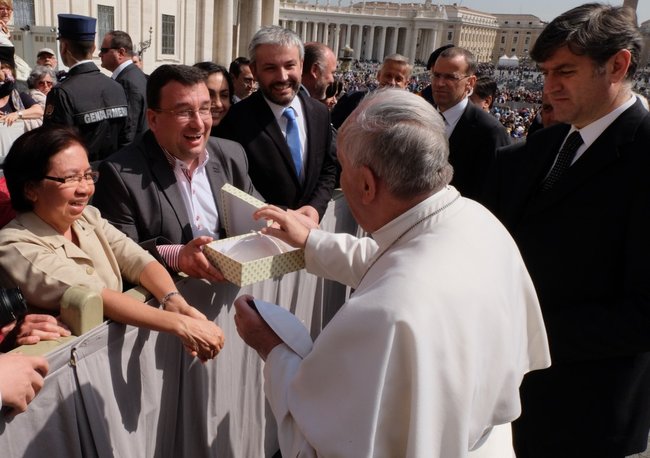 - Przygotowaliśmy dla papieża kilka prezentów. Nasza maskotka – żółty miś – wywołała na jego twarzy ogromny uśmiech. Przekazałem mu także piernikową mitrę i piuskę. Mówiłem o działalności naszego stowarzyszenia – relacjonuje swoje spotkanie z głową kościoła Robert Zaborski. - Gdy papież chciał już odejść otwarłem kartonik z piuską, którą kupiliśmy w sklepie dla duchownych w pobliżu Watykanu i powiedziałem „Chwileczkę, Ojcze Święty”. Zatrzymał się i przymierzył ją. Po czym po włosku powiedział „za mała”. Rozbawił wszystkich, gdy zdjął swoje nakrycie głowy i ubrał przyniesioną przeze mnie piuskę. Przyklepał ją, po czym ściągną i włożył z powrotem do kartonika.