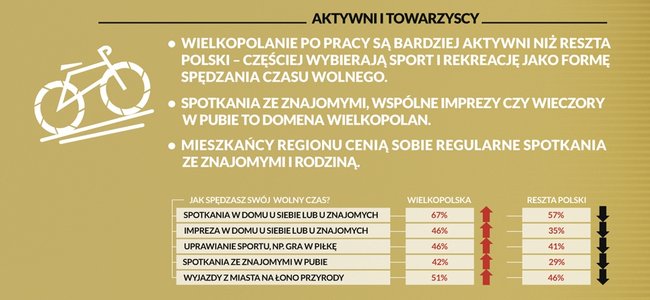 Porównując Wielkopolan z respondentami pochodzącymi z innych województw, wyraźnie można zaobserwować, że ci pierwsi prawie dwukrotnie częściej decydują się na uprawianie różnych zajęć sportowych czy spotkania ze znajomymi w pubie (tę formę aktywności wybiera 42% Wielkopolan wobec 29% pozostałych respondentów).