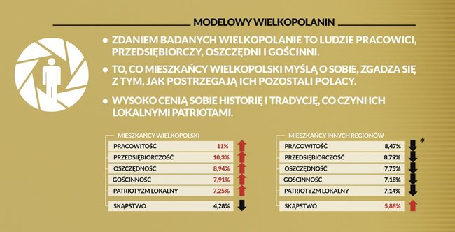 Jednym z zadań, przed którym stanęli respondenci, było wskazanie cech najbardziej kojarzących się z Wielkopolską. Czołowe miejsca w tym zestawieniu zajęły kolejno: pracowitość, przedsiębiorczość, oszczędność, gościnność i lokalny patriotyzm oraz poszanowanie dla tradycji. Stereotypowe skąpstwo znalazło się dopiero na 13. miejscu spośród 18 cech wskazanych przez badanych. Za skąpych uważa Wielkopolan niespełna 6% osób z innych regionów Polski (wśród Wielkopolan odsetek ten jest jeszcze mniejszy i wynosi 4,2%).