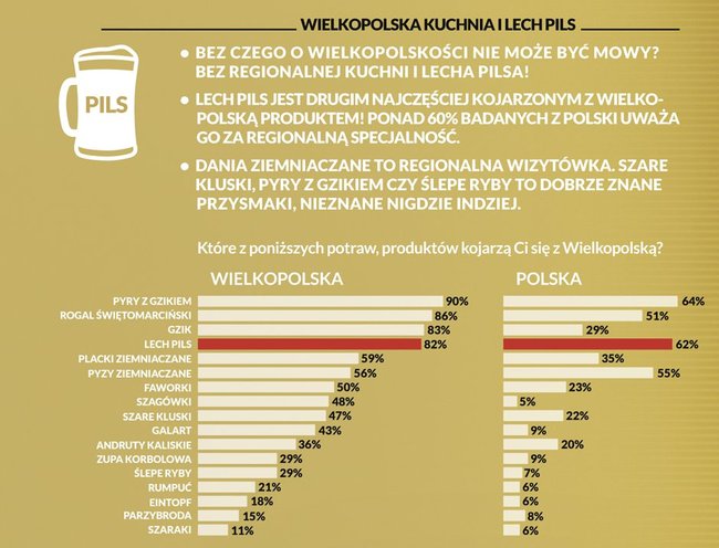 Elementem, który łączy w sobie tradycję i symbolikę, jest z kolei regionalna kuchnia. Jako typowo wielkopolskie badani wskazywali pyry z gzikiem, rogale świętomarcińskie i piwo Lech PILS.