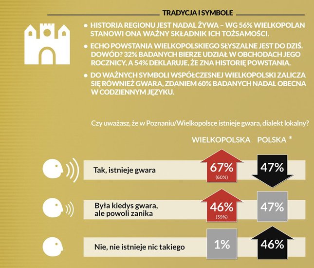 Równie istotne w budowaniu wizerunku Wielkopolan są historia, tradycja oraz symbole. Historia regionu jest ważna dla 56% badanych. Natomiast jej znajomość deklaruje 34% Wielkopolan. W społecznej świadomości istotne miejsce zajmuje powstanie wielkopolskie, którego rocznice obchodzi 32%, a historię zna 54% respondentów.