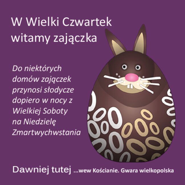 Wielkoczwartkowym zwyczajem jest obdarowywanie dzieci słodyczami przez Zajączka. Aby otrzymać łakocie, dzieci musiały zrobić gniazdko dla zająca, lub odnaleźć schowane przez niego słodycze. Bywają wielkopolskie domy, gdzie zajączek przychodzi w nocy z Wielkiej Soboty na Niedzielę Zmartwychwstania.