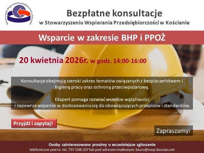 Zapraszamy przedsiębiorców oraz osoby planujące założenie działalności gospodarczej do skorzystania z bezpłatnych konsultacji w zakresie Bezpieczeństwa i Higieny Pracy (BHP).
