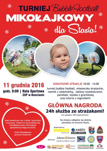 Oprócz sportowych emocji na kościaniaków, którzy zjawią się w niedzielę w hali sportowo-widowiskowej przy Zespole Szkół Ponadgimnazjalnych im. Franciszka Ratajczaka w Kościanie czekać będzie wiele atrakcji. Zebrane pieniądze zostaną przeznaczone na leczenie 3-letniego Stasia Kowalczyka z Gryżyny, który walczy z białaczką limfoblastyczną. Organizatorem imprezy jest Komenda Powiatowa Państwowej Straży Pożarnej w Kościanie wraz ze Starostwem Powiatowym oraz firmami Kom-System i Ambed.