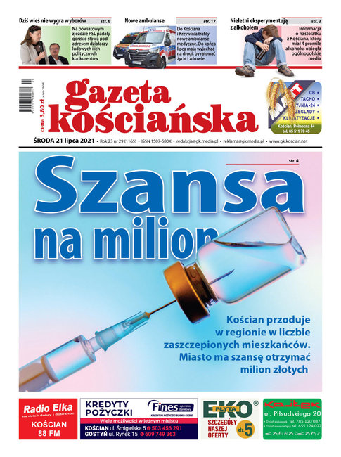 Miliony za szczepienia. Kościan zajął pierwsze miejsce w konkursie regionalnym „Najbardziej Odporna Gmina” dzięki czemu budżet miasta zasili milion złotych. Więcej na nagrody przeznaczono w konkursie „Rosnąca Odporność”. Premiowano w nim po trzy gminy w powiecie, które osiągną najwyższy wzrost poziomu zaszczepienia mieszkańców pomiędzy 1 sierpnia a 31 października 2021 r. W każdym powiecie do rozdysponowania było 1.750.000 zł. Za pierwsze miejsce 1 mln zł, za drugie 500 tys. zł, a za trzecie 250 tys. zł. W powiecie kościańskim najwyższy współczynnik wzrostu w ostatnich trzech miesiącach - 8,806 proc. - zanotowano w Śmiglu. W Czempiniu było to 8,776 proc., a w Kościanie 8,467. Do Śmigla trafi zatem milion złotych, do Czempinia pół miliona, a do Kościana ćwierć miliona złotych.
