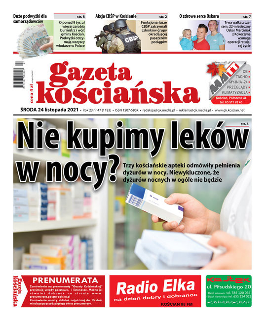 Właściciele trzech aptek w Kościanie poinformowali starostwo, że ich placówki nie będą pełnić dyżurów wyznaczonych uchwałą rady powiatu. Apteki „Dbam o Zdrowie” zlokalizowane na ul. Śmigielskiej 53 i al. Kościuszki 9 do końca roku nie będą pracować w nocy, a apteka „Centrum” działająca przy Rynku w dniach wypadającego dyżuru nocnego czynna będzie tylko do godz. 22:00. Formalnie apteki muszą pełnić wyznaczone dyżury, tyle że samorząd powiatu nie ma żadnego instrumentu aby ten obowiązek wyegzekwować.\
