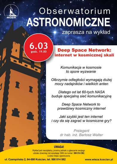 Komunikacja w kosmosie to spore wyzwanie: olbrzymie odległości wymagają dużej mocy nadajników i wielkich anten. Dlatego od lat 60-tych NASA buduje specjalną sieć, dzięki której większość sond i łazików zwiedzających inne planety lub rubieże Układu Słonecznego nadal wysyła nam fotki i daje znać, że żyje. Deep Space Network to prawdziwy kosmiczny internet, posiadający własne metody transmisji, stacje pośredniczące oraz wielkie ziemskie anteny talerzowe. Podczas wykładu dowiemy się, jaki szybki jest ten internet i czy da się zagrać w kosmiczne gry.