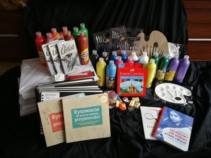Materiały trafiły już do pięciu Domów Dziecka w Warszawie, Zawierciu, Sarnowie i Kołaczycach. Nabywca wystawionego właśnie obrazu wesprze Dom Dziecka w Międzyświeciu.