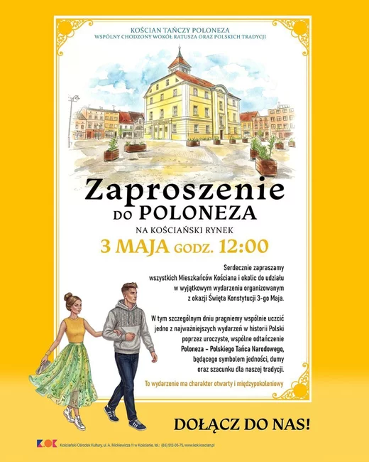 W niedzielę, 3 maja, ma kościańskim rynku, po patriotycznej uroczystości odbędą się wydarzenia o charakterze rozrywkowym i piknikowym. Odpowiadający za tę cześć przygotowań Kościański Ośrodek Kultury rozpoczął promowanie nowego, wspólnotowego wydarzenia, które połączy tradycję z radością wspólnego świętowania. Ma nim być odtańczenie poloneza.