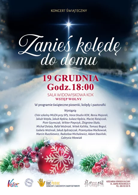 19 grudnia o godz. 18:00 w Kościańskim Ośrodku Kultury odbędzie się wyjątkowy świąteczny koncert „Zanieś kolędę do domu”. To wydarzenie, które łączy magię muzyki z realnym wsparciem dla osób potrzebujących. Wstęp jest wolny, a podczas koncertu prowadzona będzie zbiórka do puszek na rzecz Stowarzyszenia Dać Pomoc.