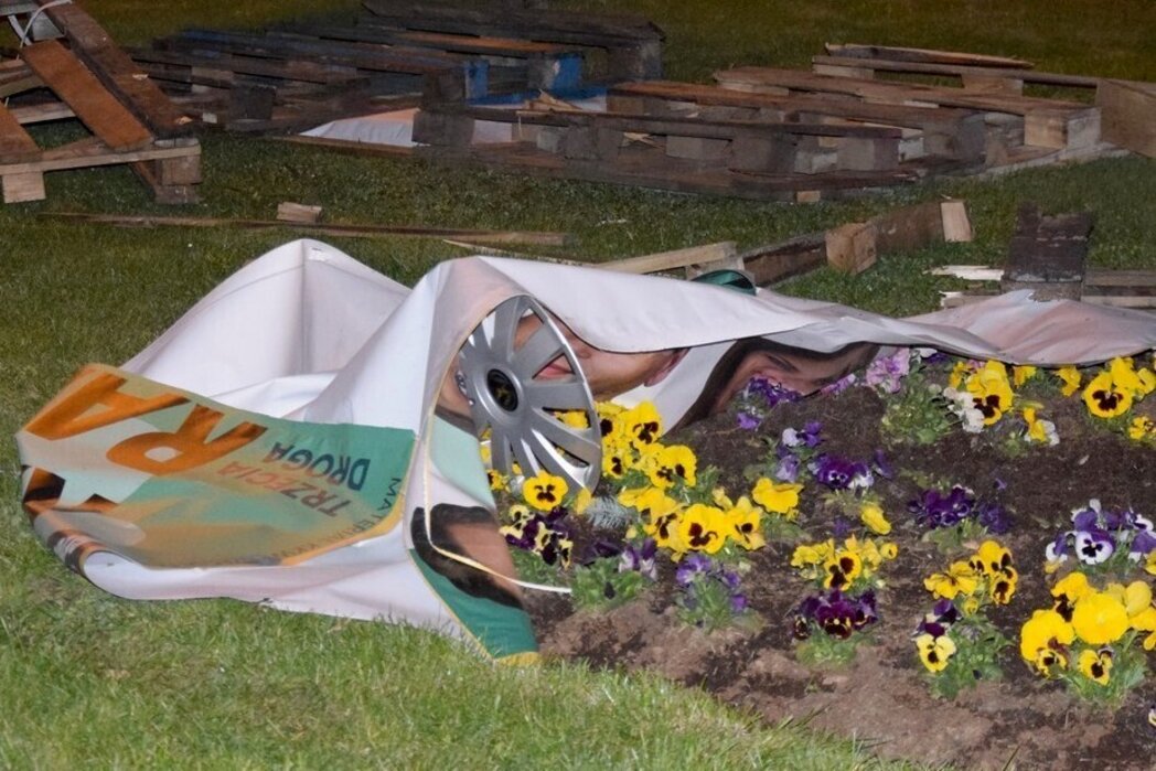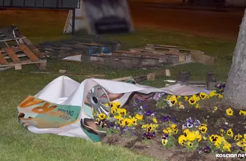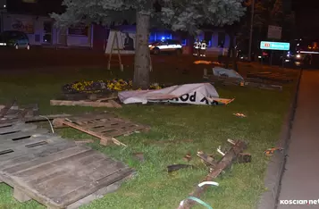 Osiemnastoletni kierowca stracił panowanie nad samochodem i wjechał w pas zieleni, na którym ustawione były banery wyborcze.