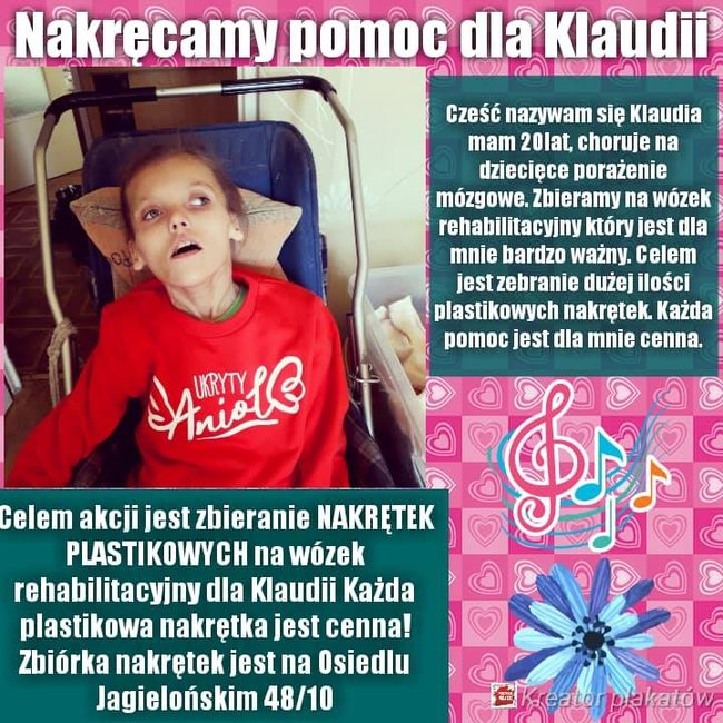 Klaudia Pawlaczyk ma 20 lat i choruje na dziecięce porażenie mózgowe. Możecie jej pomóc w zdobyciu niezbędnego wózka rehabilitacyjnego zbierając plastikowe nakrętki. Można je dostarczać na oś Jagiellońskie nr 48/10 w Kościanie.