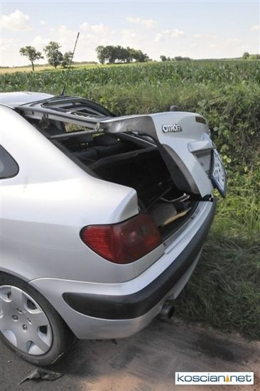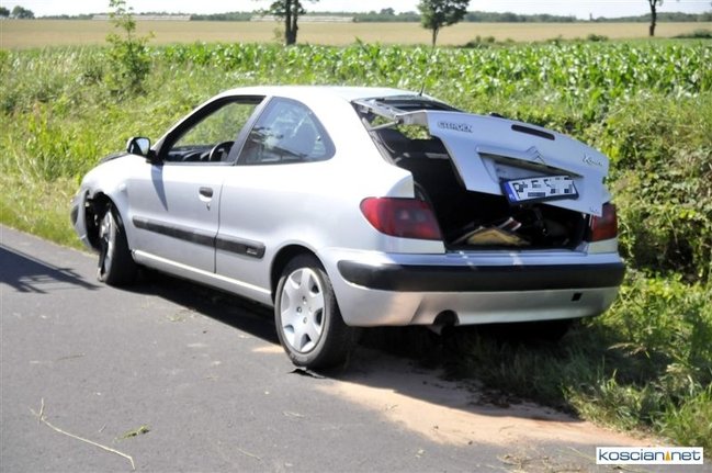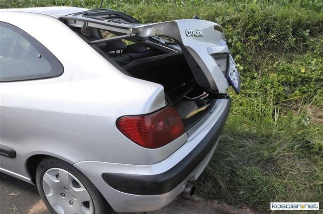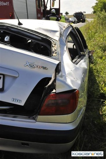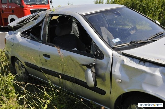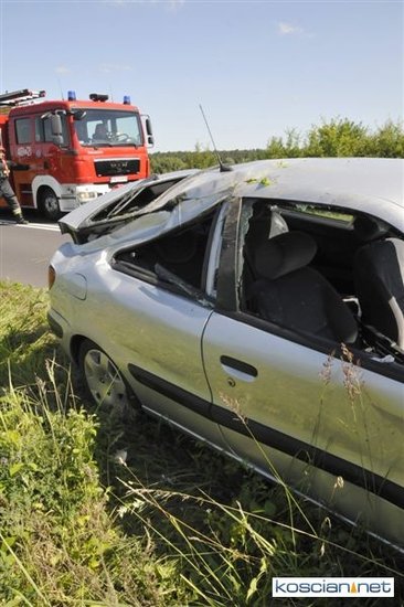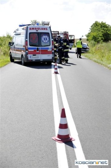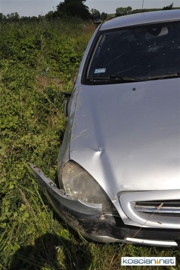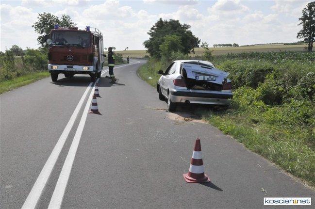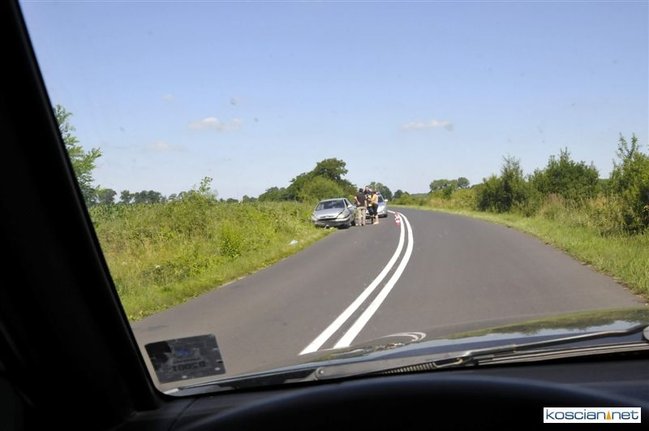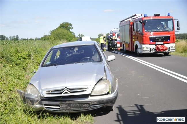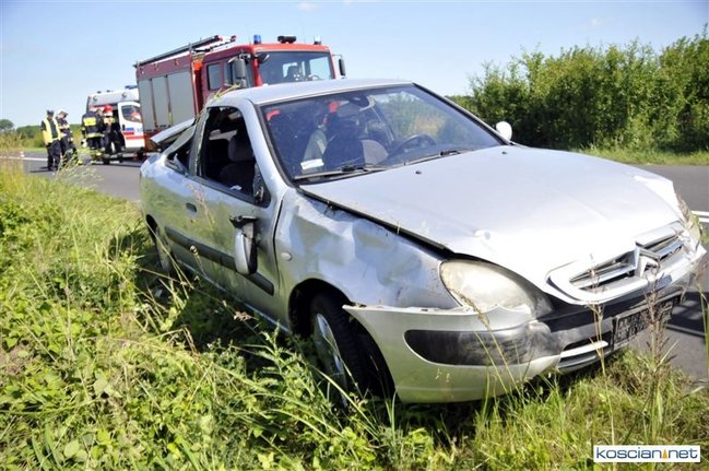 O godzinie 9.58 przyjęto zgłoszenie o kolizji, do której doszło na drodze z Gryżyny do Osieka. Jak wynika z relacji kierującej citroenem xsara 21-letniej mieszkanki powiatu leszczyńskiego została ona zmuszona do zjechania z drogi przez białego dostawczego busa, który miał nieprawidłowo wykonywać manewr wymijania. Chcąc uniknąć zderzenia zjechała do rowu po czym samochód dachował. Na miejscu interweniowały jednostki PSP Kościan i OSP Gryżyna, ratownicy medyczni i policja.