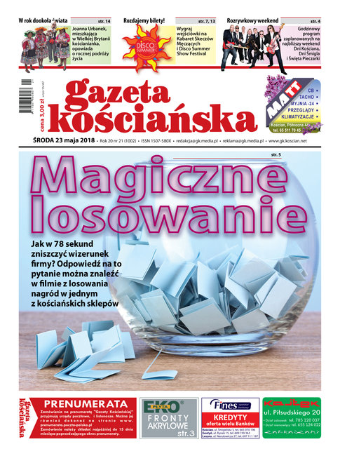 W numerze między innymi: o popularnym w sieci 78-sekundowym filmie z kościańskiego sklepu, rozdajemy bilety na kabaret i Boney M., program Dni Kościana, Dni Śmigla i Święta Pieczarki, o pierwszym wyroku za spalanie śmieci, o hucułach z Katarzynina, o rocznej podróży dookoła świata, o święcie strażaków i nocy muzeów. Ponadto: ilustrowany przegląd wydarzeń tygodnia z wszystkich gmin powiatu kościańskiego, kronika policyjna, informator kulturalny i obszerny serwis sportowy. Gazeta w sprzedaży od 23 maja