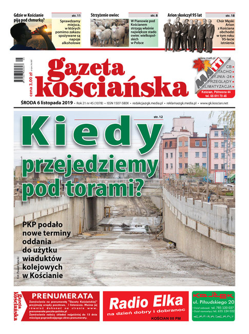 W numerze między innymi: o nowych terminach zakończenia budowy tuneli pod torami w Kościanie, o wzroście podatków w Śmiglu i Krzywiniu, o wielkim strzyżeniu owiec w Pianowie, o tym gdzie kościaniacy piją pod chmurką, o otwarciu amerykańskiej fabryki, o odpadach zalegających w jednej z firm w Czempiniu, o jubileuszach chóru Arion i spółdzielni KOSS, o obawach przed budową kopalni węgla. Ponadto: ilustrowany przegląd wydarzeń tygodnia z wszystkich gmin powiatu kościańskiego, kronika policyjna, informator kulturalny i obszerny serwis sportowy. Gazeta w sprzedaży od 6 listopada