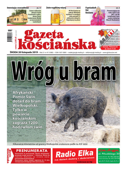 W numerze między innymi: o afrykańskim pomorze świń, o wszystkich gwiazdach Dni Kościana, o milionach złotych wydanych na alkohol, o szkole bez zadań domowych, o gazie z oczyszczalni ścieków, o za małej liczbie miejsc w pociągach, o rozbudowie stacji uzdatniania wody, o bezdomnych w Kościanie, o jubileuszu Arionu. Ponadto: ilustrowany przegląd wydarzeń tygodnia z wszystkich gmin powiatu kościańskiego, kronika policyjna, informator kulturalny i obszerny serwis sportowy. Gazeta w sprzedaży od 20 listopada