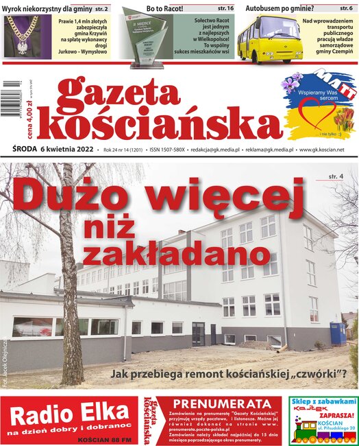 W numerze między innymi: o przebiegu inwestycji i dużo większym niż zakładano zakresie prac remontowych w kościańskiej „czwórce”, o 1,4 mln złotych jakie gmina Krzywiń zabezpieczyła na spłatę zobowiązań wobec wykonawcy drogi Jurkowo – Wymysłowo, o przygotowaniach do uruchomienia komunikacji publicznej w gminie Czempiń, o przyszłości dworku Wańkowiczów w Jerce, o radnym węszącym przekręt, o sukcesach sołectwa Racot. Ponadto: ilustrowany przegląd wydarzeń tygodnia z wszystkich gmin powiatu kościańskiego, kronika policyjna i obszerny serwis sportowy. Gazeta w sprzedaży od 6 kwietnia.