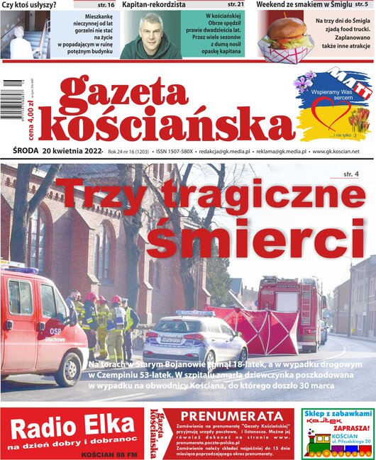 W numerze między innymi: o trzech tragicznych śmierciach, o pani Janinie mieszkającej w popadającym w ruinę potężnym budynku, o kompleksowej modernizacji Stacji Uzdatniania Wody Łazienki w Kościanie, o kapitanie rekordziście z piłkarskiej „Obry”. Ponadto: ilustrowany przegląd wydarzeń tygodnia z wszystkich gmin powiatu kościańskiego, kronika policyjna i obszerny serwis sportowy. Gazeta w sprzedaży od 19 kwietnia.