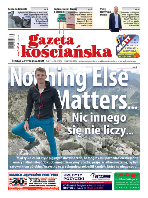W numerze między innym: o 21-letnim Dominiku, który kochał góry i w górach zginął, o wyroku sądowym w sprawie zmiany adresów mieszkańców Piotrkowic, o budzącej zastrzeżenia fermie lisów, rozmowa z nowym dyrektorem kościańskiej „czwórki”, o staraniach spadkobierców o odzyskanie pałacu w Cichowie, o rowerzystach pod wiaduktem kolejowym, o bardzo obszernej odpowiedzi na zapytanie radnego, o kolejnej inwestycji kościańskich wodociągów. Ponadto ilustrowany przegląd wydarzeń tygodnia z wszystkich gmin powiatu kościańskiego, kronika policyjna oraz serwis sportowy. Gazeta w sprzedaży od 23 września.