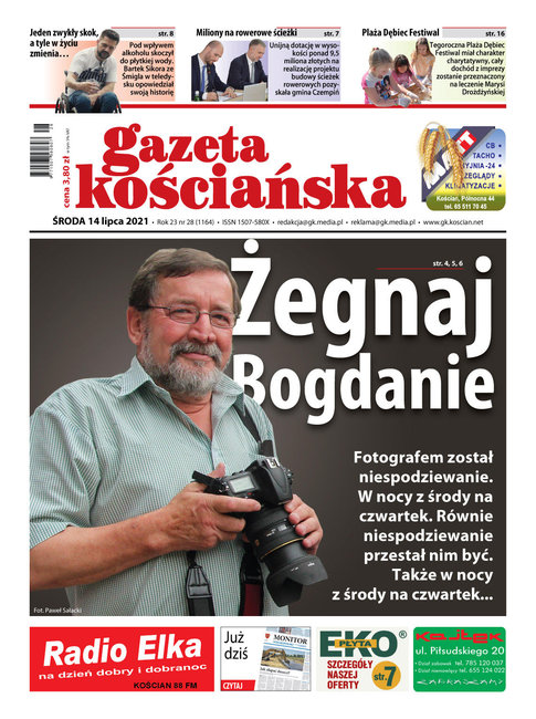 W numerze między innym: żegnamy Bogdana Ludowicz – najbardziej kościańskiego fotografa na świecie, piszemy o milionach na ścieżki rowerowe w gminie Czempiń, o teledysku z przesłaniem, o szkolnej telewizji z Nietążkowa, o chudnięciu dla zdrowia i dla małej Marysi, o piecu chlebowym z Nowego Lubosza, o charytatywnym festiwalu w Nowym Dębcu. Ponadto: lustrowany przegląd wydarzeń tygodnia z wszystkich gmin powiatu kościańskiego, kronika policyjna i obszerny serwis sportowy oraz MONITOR WIELKOPOLSKI. Gazeta w sprzedaży od 14 lipca.