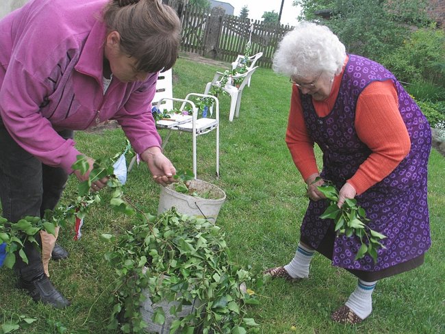Jest środa, 21 maja. Ruch we wsi trwa już od kilku godzin. Bo to trzeba gałązek i liści narwać, wstążek z kolorowej krepy naciąć, sznur przysposobić, girlandę upleść, drągi ze stodoły wyciągnąć itd.- Takie tradycyjne girlandy - najpiękniejsze - ocenia Marianna Sosińska, rodowita bronikowianka. Mieszka w centrum wsi. Ma 81 lat. - Oj, napletłam ja się takich... Ze sześćdziesiąt lat pletłam, albo i więcej. Od dwóch lat, jak się pochorowałam, już tego nie robię - zamyśla się, ale zaraz z ochotą instruuje. - Sznur trzeba mieć mocny. Dawniej zwykły, ale bardzo gruby, a teraz to taki od snopowiązałki się bierze. Dobry, bo się nie rozciąga. Splata się go tak we trzy i potem do niego bukieciki z dębowych gałązek przykłada, obwiązuje, a każdy tak, żeby całe wiązanie poprzedniego przykrył. I tak kilkaset takich bukiecików obwiązać trzeba, żeby girlanda nad całą ulicą być mogła. Jak się to dokładnie robi, to i kilka godzin na tym zejdzie...
